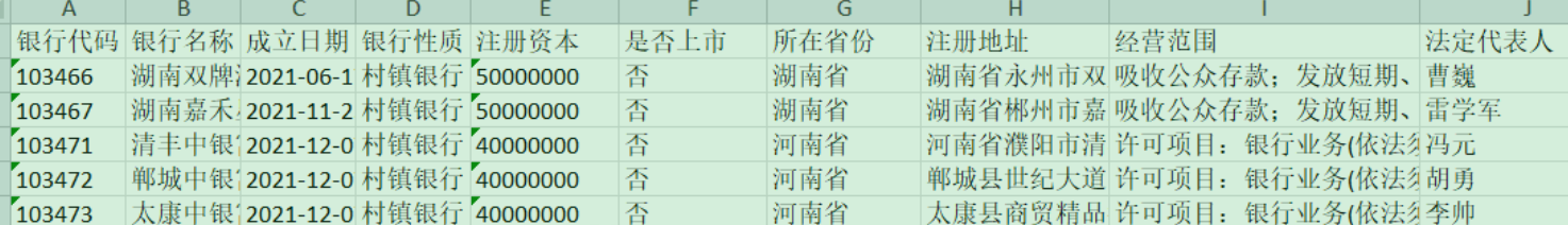 银行代码 银行名称 成立日期 银行性质 注册资本 是否上市 所在省份 注册地址 经营范围 法定代表人 总经理