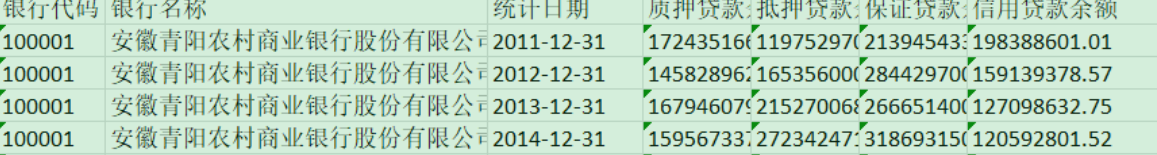 银行代码 银行名称 统计日期 质押贷款余额 抵押贷款余额 保证贷款余额 信用贷款余额