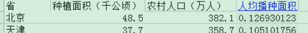 3.数据范围:包括中国31个省份,具体指标为省、种植面积(千公顷)、农村人口(万人)、人均播种面积- }9 d8 i4 [3 N. Z0 F; R