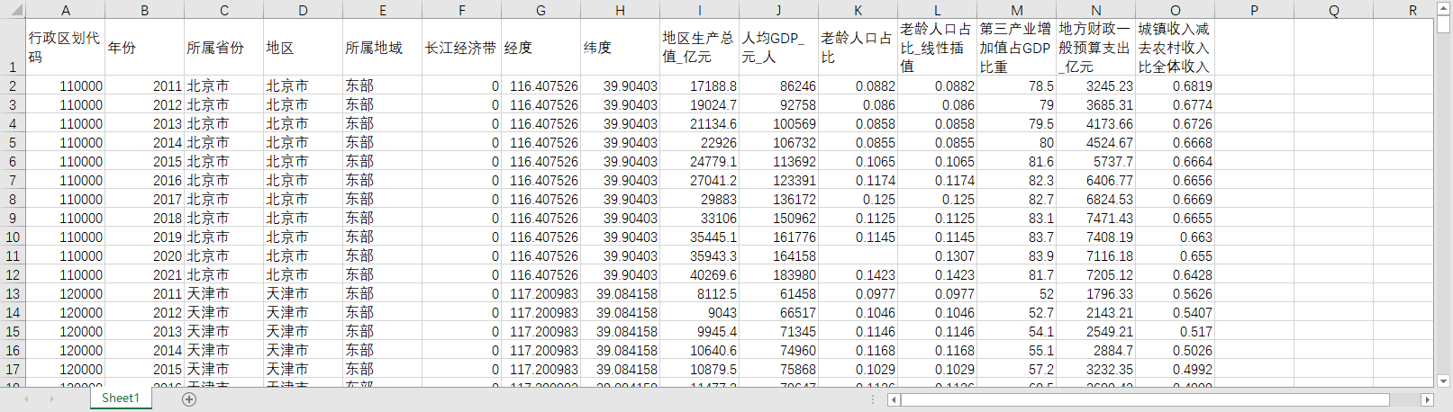 行政区划代码 年份 所属省份 地区 所属地域 长江经济带 经度 纬度 地区生产总值_亿元 人均GDP_元_人 老龄人口占比 老龄人口占比_线性插值 第三产业增加值占GDP比重 地方财政一般预算支出_亿元 城镇收入减去农村收入比全体收入
