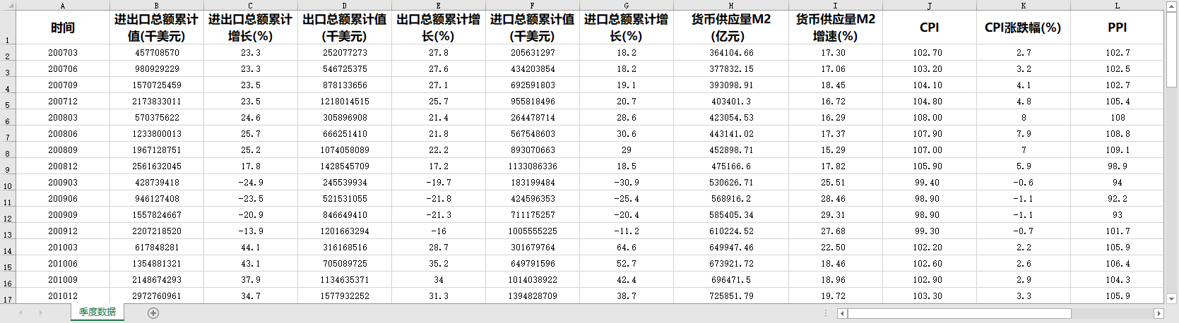 全国宏观经济季度数据200703-202303进出口总额累计值增长率货币供应量M2增速CPIPPI涨跌幅社会融资规模