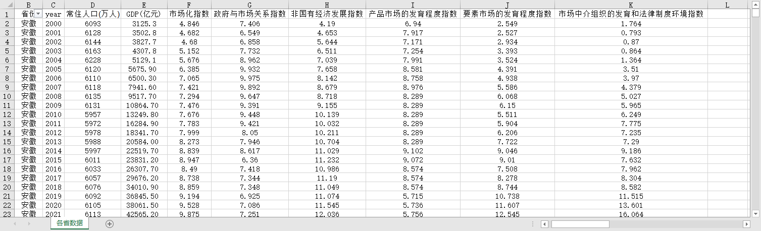省份 year 常住人口(万人) GDP(亿元) 市场化指数 ZF与市场关系指数 非国有经济发展指数 产品市场的发育程度指数 要素市场的发育程度指数 市场中介组织的发育和法律制度环境指数