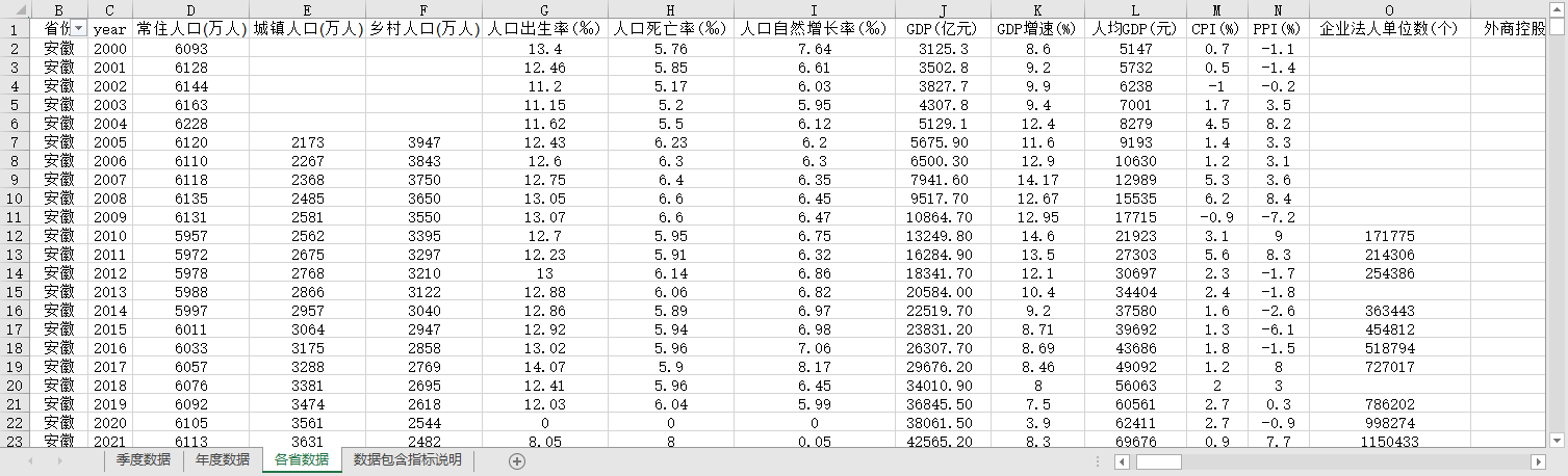 | 宏观经济 | GDP及增速,第一产业增加值、第二产业增加值、第三产业增加值,工业增加值、金融业增加值,人均GDP、CPI及增速、PPI及增速,企业法人单位数、外商控股企业法人单位数 |