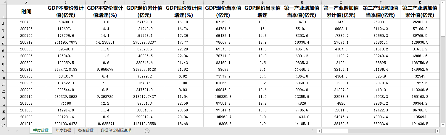| 宏观经济 | GDP不变价及增速、GDP现价及增速,第一产业增加值、第二产业增加值、第三产业增加值,工业增加值、金融业增加值,农业机械总动力,人均GDP,货币供应量M2及增速、CPI及增速、PPI及增速,企业法人单位数、外商控股企业法人单位数,社会融资规模 |