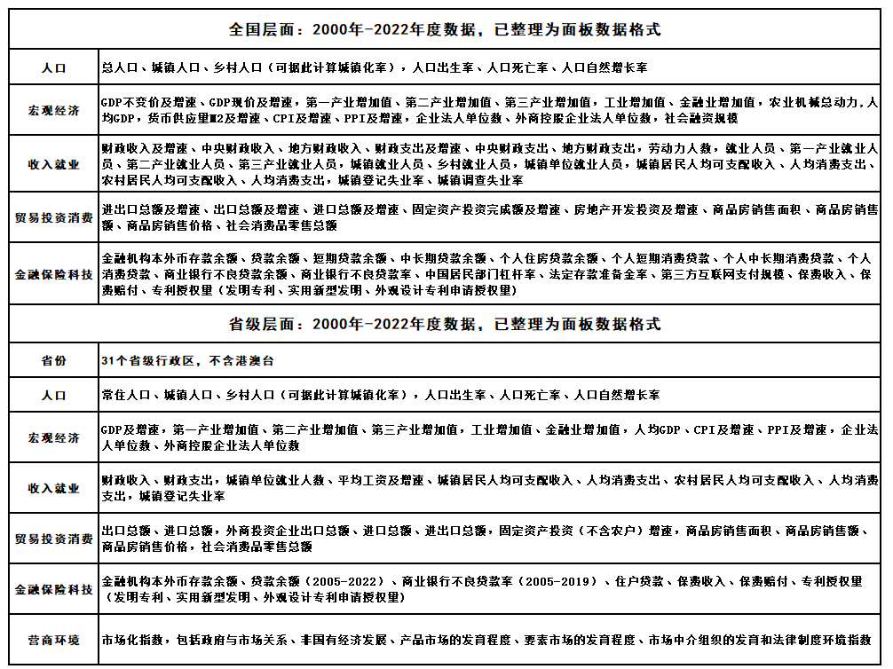 | 省级层面:2000年-2022年度数据,已整理为面板数据格式 |