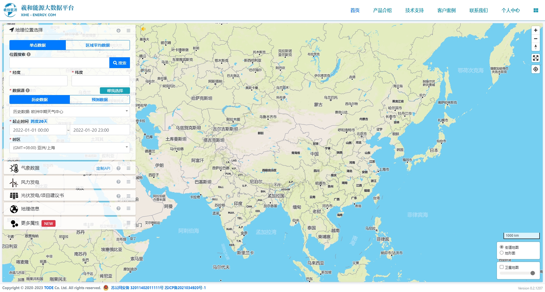 羲和能源大数据平台(xihe-energy.com)由南京图德科技有限公司开发,于2022年2月上线运行。平台能够实时下载全球任意单点位置或地域平均统计的历史40年至未来7日预测的11种气象小时级数据,及以此为基准生成的风电、光伏发电功率数据。同时还可以提供多种地理信息数据和260余种更多属性数据定制下载。