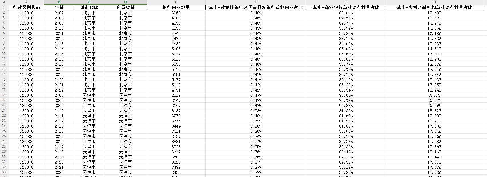 二、指标说明共计8个指标:行政区划代码、年份、城市名称、所属省份、银行网点数量、其中-政策性银行及国家开发银行营业网点占比、其中-商业银行营业网点数量占比、其中-农村金融机构营业网点数量占比