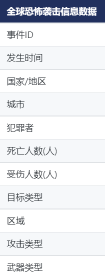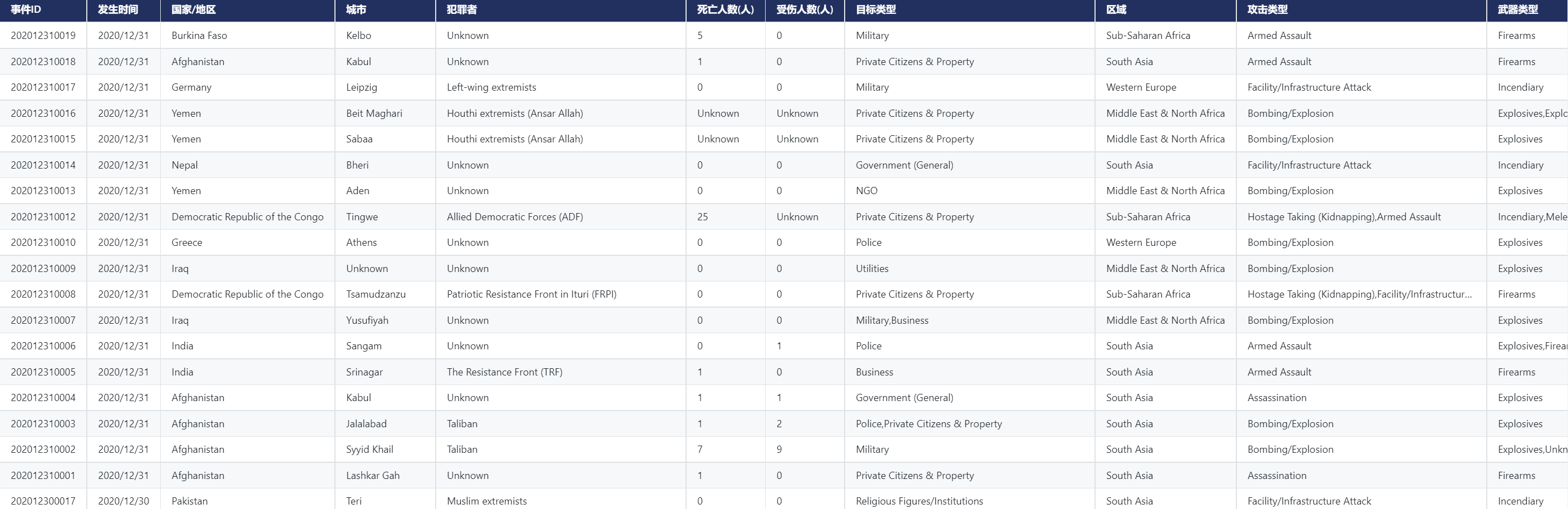 全球恐怖袭击信息数据包含1970-2022年期间发生的20万多起恐怖袭击事件,具体包括事件ID、发生时间、国家/地区、城市、犯罪者、死亡人数(人)、受伤人数(人)、目标类型、区域、攻击类型、武器类型等字段。