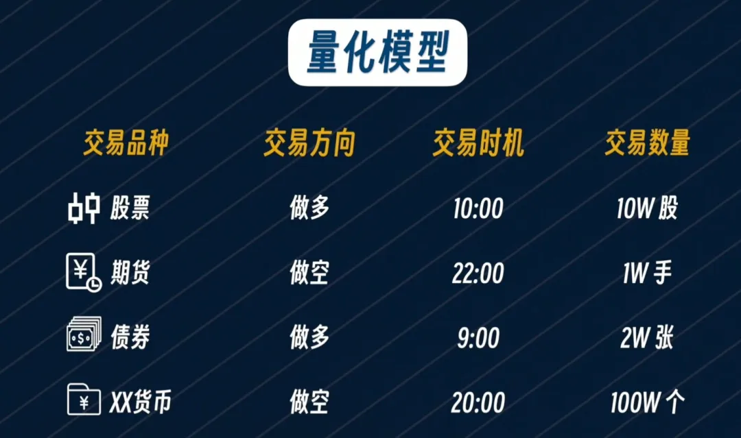 它决定了你交易的品种、方向、时机和数量,即交易的一切信息。只要符合这个定义,我都认为是量化投资。