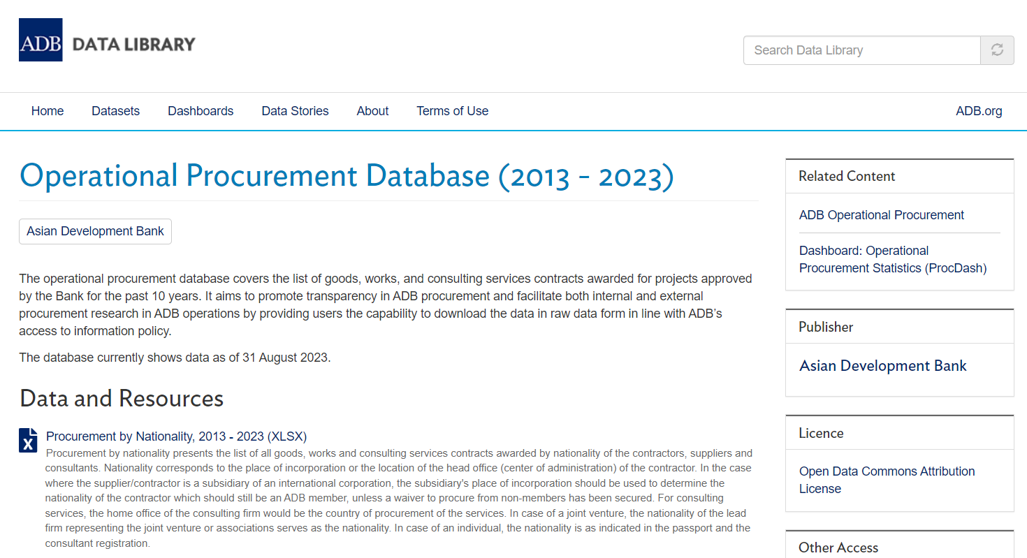 涵盖过去10年世行批准的项目授予的货物、工程和咨询服务合同清单。它旨在通过为用户提供符合亚行信息获取政策的原始数据形式下载数据的能力,提高亚行采购的透明度,并促进亚行业务中的内部和外部采购研究。