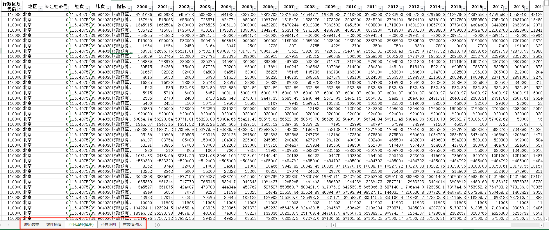 将《中国财政年鉴》转为面板数据,利用线性趋势对中间缺失进行填充,得到线性插值版,利用时间趋势,对剩余缺失进行预测,得到ARIMA填补版,最终,保留原始版本、线性插值版、ARIMA填补版。
