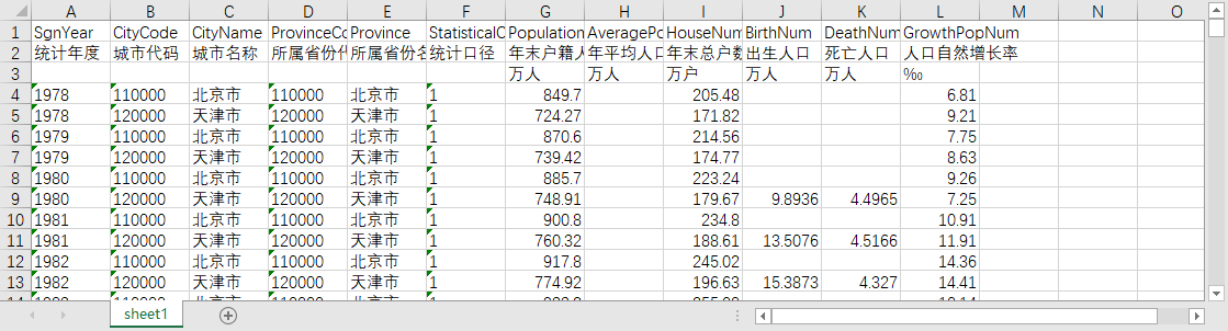 统计年度 城市代码 城市名称 所属省份代码 所属省份名称 统计口径 年末户籍人口 年平均人口 年末总户数 出生人口 死亡人口 人口自然增长率