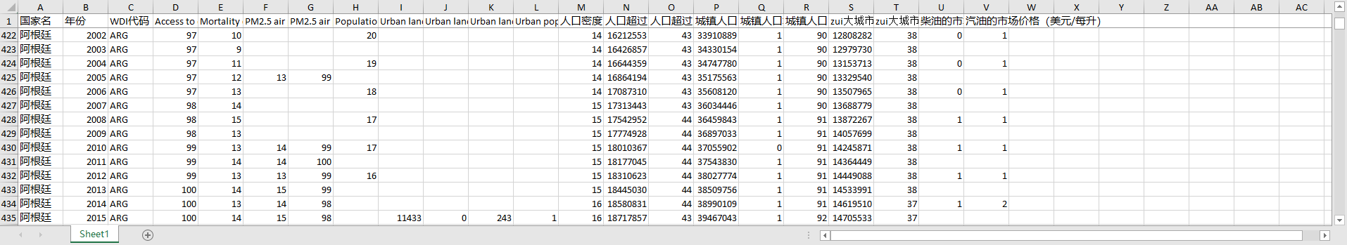 国家名 年份 WDI代码 Access to electricity, urban (% of urban population) Mortality caused by road traffic injury (per 100,000 people) PM2.5 air pollution, mean annual exposure (micrograms per cubic meter) PM2.5 air pollution, population exposed to levels exceeding WHO guideline value Population living in slums (% of urban population) Urban land area (sq. km) Urban land area where elevation is below 5 meters (% of total land area) Urban land area where elevation is below 5 meters (sq. km) Urban population living in areas where elevation is below 5 meters (% of total p (用电情况、城市(占城市人口的%)道路交通伤害造成的死亡率(每10万人)PM2.5空气污染、PM2.5空气污染物年均暴露量(微克/立方米)、,暴露于超过世界卫生组织指导值水平的人口生活在贫民窟的人口(占城市人口的%)城市土地面积(平方公里)海拔低于5米的城市土地面积)