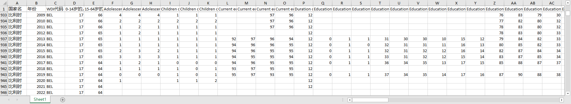 国家名 年份 WDI代码 0-14岁的人口(占总人口的百分比) 15-64岁的人口(占总人口的百分比) Adolescents out of school (% of lower secondary school age) Adolescents out of school, female (% of female lower secondary school age) Adolescents out of school, male (% of male lower secondary school age) Children out of school (% of primary school age) Children out of school, female (% of female primary school age) Children out of school, male (% of male primary school age) Current education expenditure, primary (% of total expenditure in primary public Current education expenditure, secondary (% of total expenditure in secondary pu Current education expenditure, tertiary (% of total expenditure in tertiary publ Current education expenditure, total (% of total expenditure in public instituti Duration of compulsory education (years) Educational attainment, Doctoral or equivalent, population 25+, female (%) (cumu Educational attainment, Doctoral or equivalent, population 25+, male (%) (cumula Educational attainment, Doctoral or equivalent, population 25+, total (%) (cumul Educational attainment, at least Bachelor's or equivalent, population 25+, femal Educational attainment, at least Bachelor's or equivalent, population 25+, male Educational attainment, at least Bachelor's or equivalent, population 25+, total Educational attainment, at least Master's or equivalent, population 25+, female Educational attainment, at least Master's or equivalent, population 25+, male (% Educational attainment, at least Master's or equivalent, population 25+, total ( Educational attainment, at least completed lower secondary, population 25+, fema Educational attainment, at least completed lower secondary, population 25+, male Educational attainment, at least completed lower secondary, population 25+, tota Educational attainment, at least completed post-secondary, population 25+, femal Educational attainment, at least completed post-secondary, population 25+, male Educational attainment, at least completed post-secondary, population 25+, total Educational attainment, at least completed primary, population 25+ years, female Educational attainment, at least completed primary, population 25+ years, male ( Educational attainment, at least completed primary, population 25+ years, total Educational attainment, at least completed short-cycle tertiary, population 25+, Educational attainment, at least completed short-cycle tertiary, population 25+, Educational attainment, at least completed short-cycle tertiary, population 25+, Educational attainment, at least completed upper secondary, population 25+, fema Educational attainment, at least completed upper secondary, population 25+, male Educational attainment, at least completed upper secondary, population 25+, tota Effective transition rate from primary to lower secondary general education, bot Expenditure on primary as % of government expenditure on education (%) Expenditure on secondary as % of government expenditure on education (%) Expenditure on tertiary as % of government expenditure on education (%) Lower secondary completion rate, female (% of relevant age group) Lower secondary completion rate, male (% of relevant age group) Lower secondary completion rate, total (% of relevant age group) Number of deaths ages 10-14 years Number of deaths ages 15-19 years Number of deaths ages 20-24 years Number of deaths ages 5-9 years Over-age students, primary (% of enrollment) Over-age students, primary, female (% of female enrollment) Over-age students, primary, male (% of male enrollment) Percentage of female teachers in secondary education who are trained, female (%) Percentage of male teachers in secondary education who are trained, male (%) Percentage of teachers in secondary education who are trained, both sexes (%) Preprimary education, duration (years) Probability of dying among adolescents ages 10-14 years (per 1,000) Probability of dying among adolescents ages 15-19 years (per 1,000) Probability of dying among children ages 5-9 years (per 1,000) Probability of dying among youth ages 20-24 years (per 1,000) Progression to secondary school, female (%) Progression to secondary school, male (%) Pupil-teacher ratio in pre-primary education (headcount basis) Pupil-teacher ratio, lower secondary Pupil-teacher ratio, tertiary Pupil-teacher ratio, upper secondary Trained teachers in lower secondary education (% of total teachers) Trained teachers in lower secondary education, female (% of female teachers) Trained teachers in lower secondary education, male (% of male teachers) Trained teachers in preprimary education (% of total teachers) Trained teachers in preprimary education, female (% of female teachers) Trained teachers in preprimary education, male (% of male teachers) Trained teachers in upper secondary education (% of total teachers) Trained teachers in upper secondary education, female (% of female teachers) Trained teachers in upper secondary education, male (% of male teachers) 一年级净入学率,女童(占官方定义的学龄人口的百分比) 一年级净入学率,男童(占官方定义的学龄人口的百分比) 一年级学生净入学率(占官方学龄人口的百分比) 一年级新生总入学率,女性(占相关年龄组的百分比) 一年级新生总入学率,总体(占相关年龄组的百分比) 一年级新生总入学率,男性(占相关年龄组的百分比) 中学人均的支出(占人均 GDP 的百分比) 中学入学年龄(年) 中学女生与男生的入学比例(%) 中学师生比例 中学教育,一般学生 中学教育,一般学生(女生所占百分比) 中学教育,学生 中学教育,学生(女生所占百分比) 中学教育,年限(年) 中学教育,接受职业教育的学生 中学教育,接受职业教育的学生(女性所占百分比) 中学教育,教师 中学教育,教师 (女性所占百分比) 中学教育,教师,女性 中小学女生与男生的入学比例(%) 五年级持续就学率,女童(占同龄