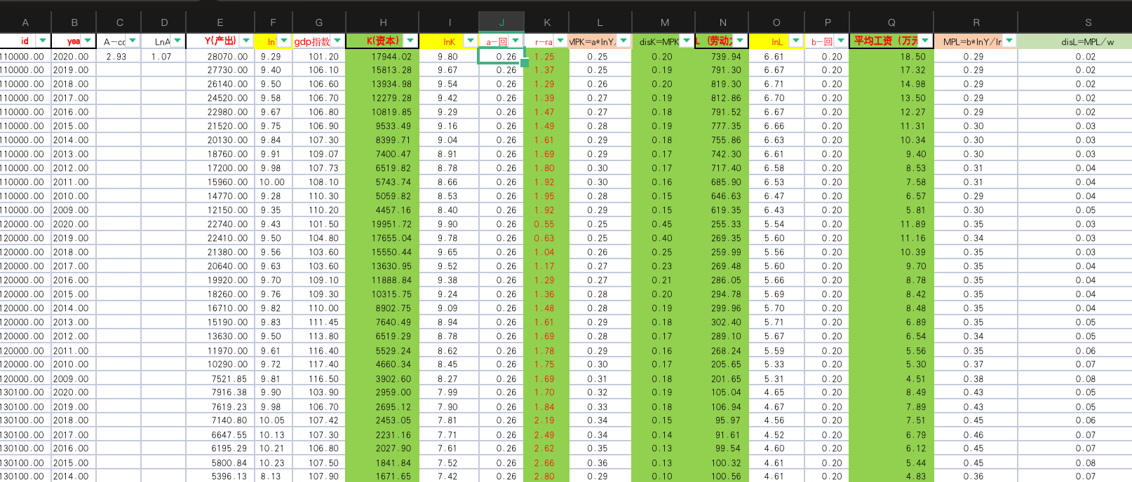 目前,网上流传的我国地级市资源扭曲测算步骤及结果含糊不清,且无固定模板,不能根据实际需要切换基期,在导师的指导和帮助下,我花费大量时间收集、整理,参考权威文献测算了这份独家发布、原创整理的2009-2020年我国300个地级市资源扭曲(错配)程度计算模板,可以通过手动输入变量指标,并可根据实际需要删减或增加城市以及更新数据年份。