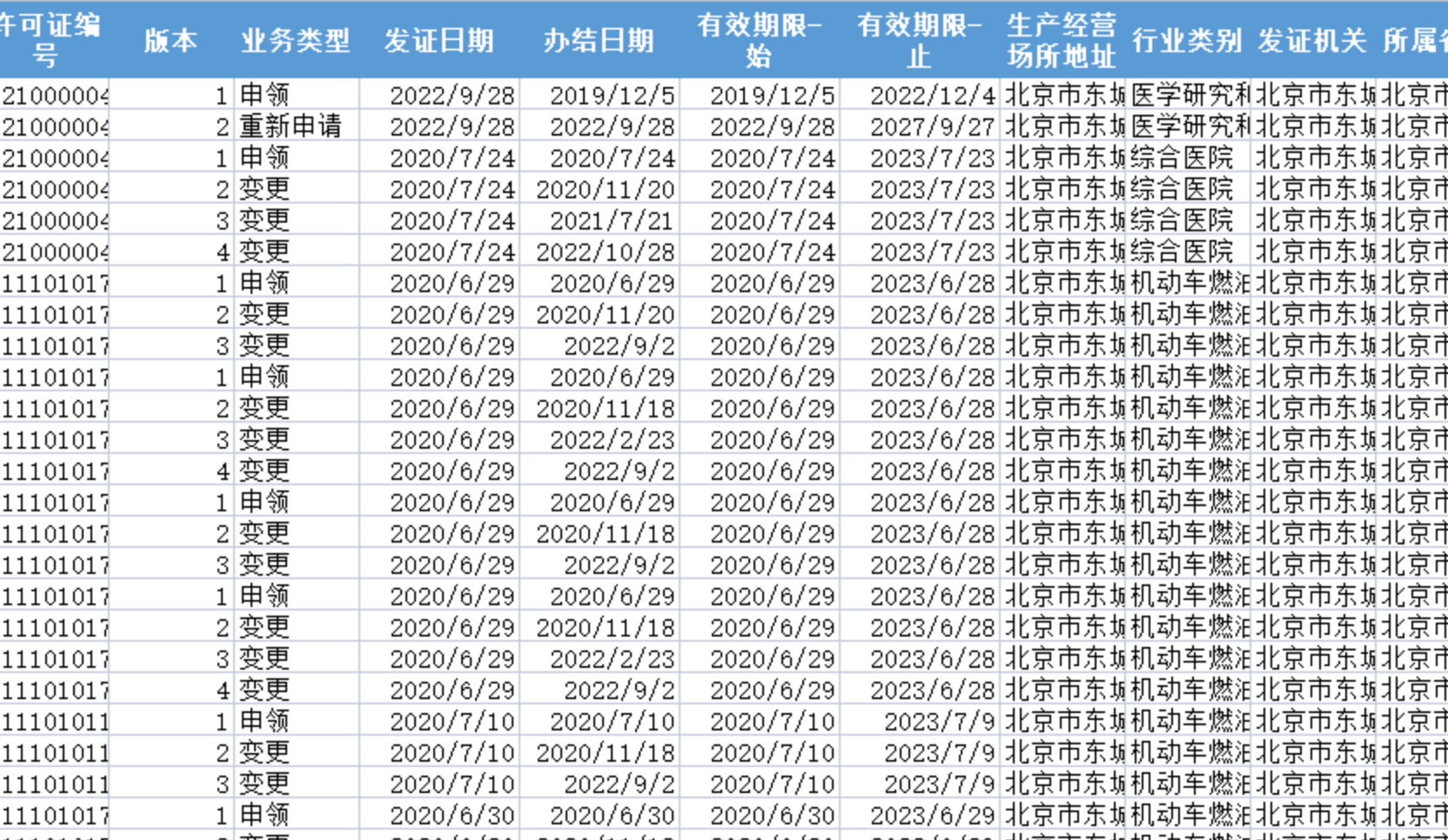 数据包括:单位名称、许可证编号、版本、业务类型、发证日期、办结日期、有效期限、生产经营场所地址、行业类别、发证机关、所属省份、所属省份代码、所属城市、所属城市代码、所属区县、所属区县代码、主要污染物类别、大气主要污染物种类、大气污染物排放规律、大气污染物排放执行标准、废水主要污染物种类、废水污染物排放规律、废水污染物排放执行标准、排污权使用和交易信息