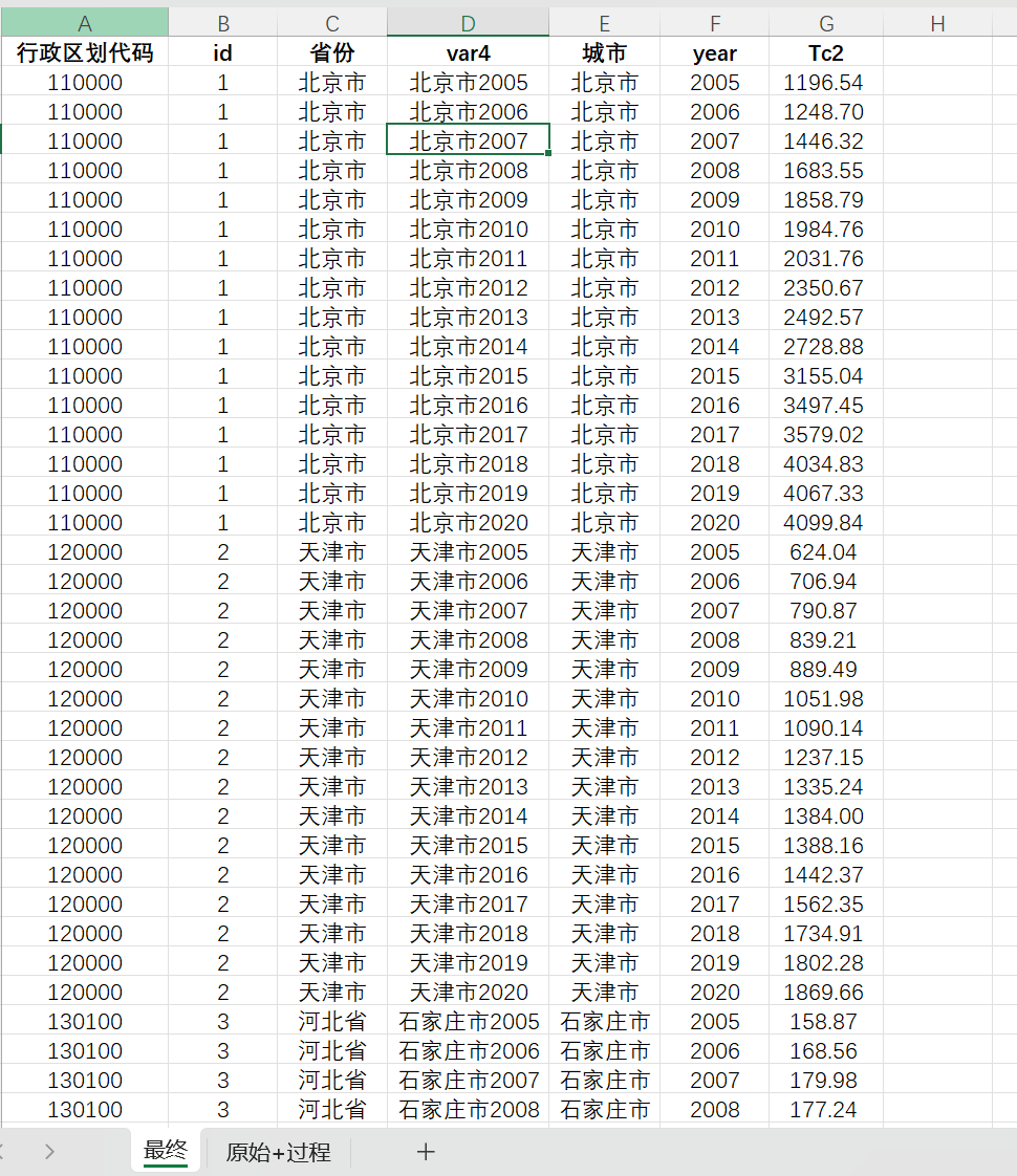 第二个表是原始数据+补全+计算,同时也转化为面板数据,方便大家使用,也加了行政区代码以及排好序的id