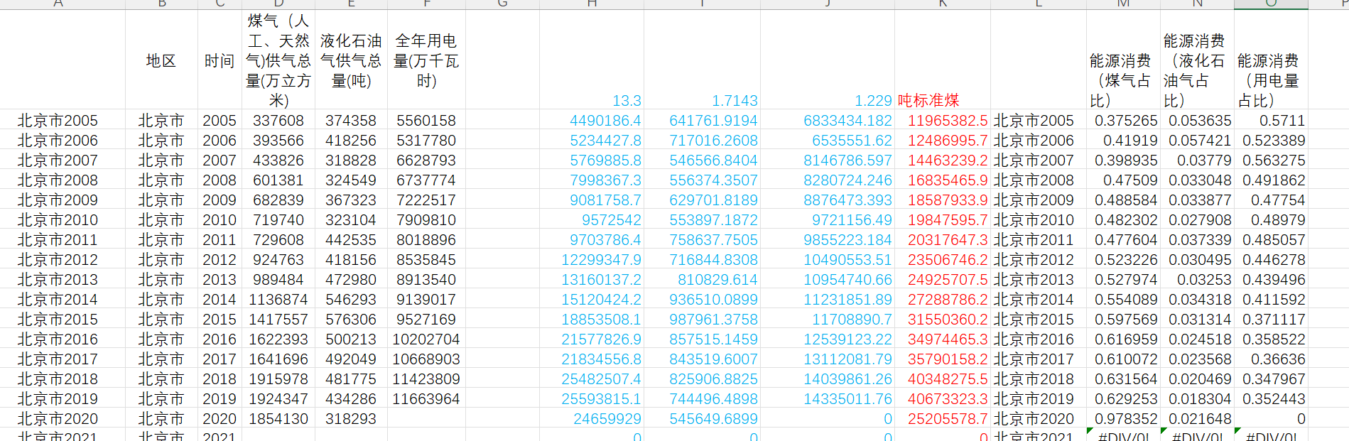 纯手工整理,现在网上关于能源消耗的数据有许多缺失值,无法直接使用,在此基础上,本人从eps与各统计年鉴整理合并,尽量补全缺失数值,最后个别地级市实在找不到数值的通过插值法进行补全,结果见图,亲测有效,自己可以随便找几个年鉴数据试试就知道正确与否,计算公式为煤气(人工、天然气)供气总量(万立方米)*13.3+液化石油气供气总量(吨)*1.7143+全年用电量(万千瓦时)*1.229=吨标准煤