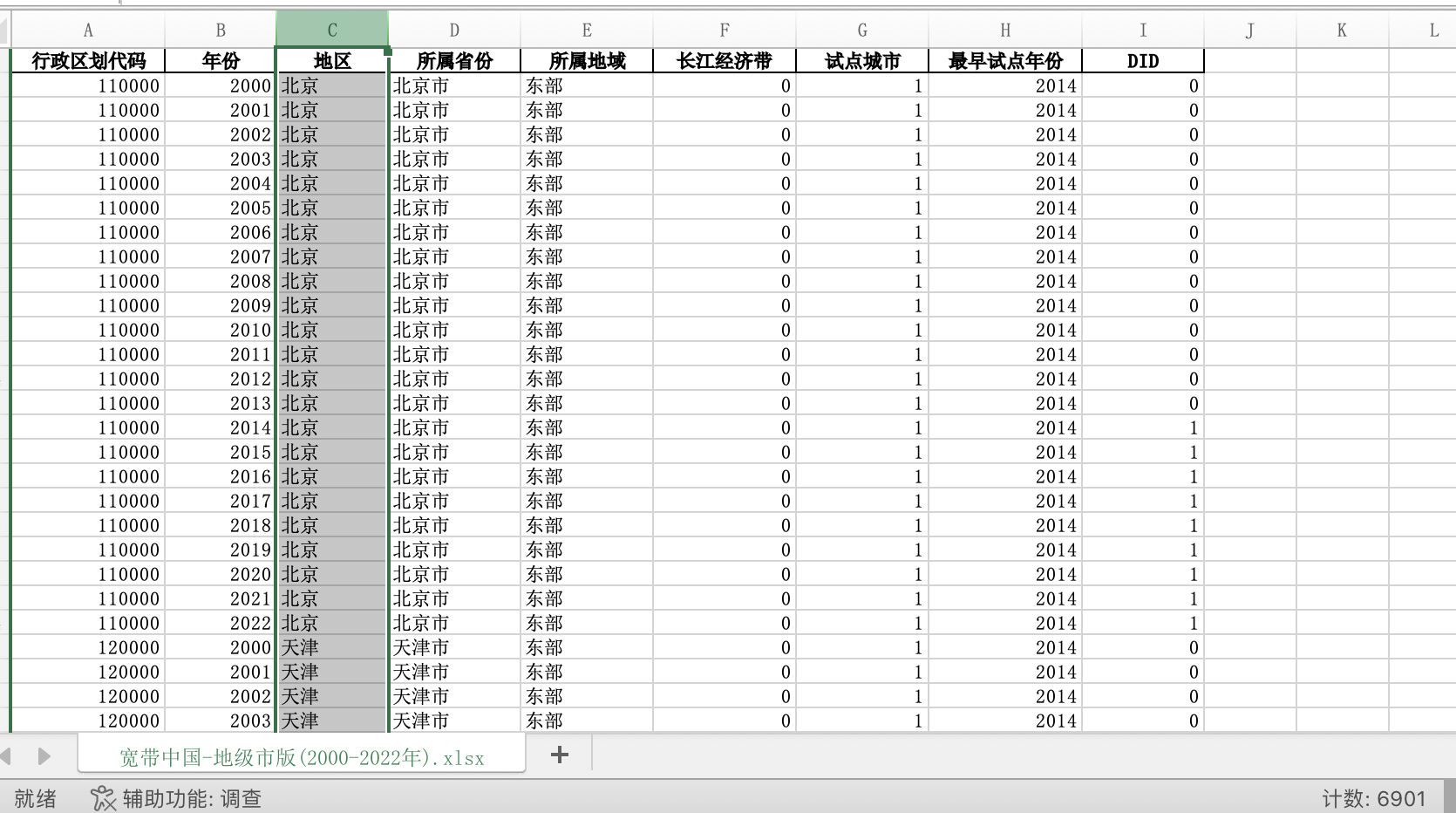 数据名称:全国各省300城市地级市宽带中国试点城市名单匹配城市DID