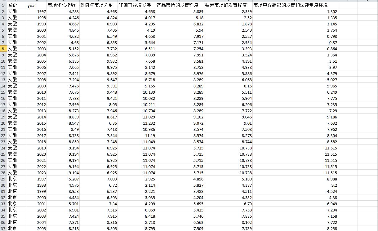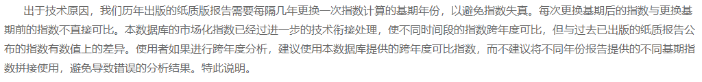 市面上的数据大多是根据樊纲中国市场化指数报告得到1997-2019年的数据,然后外推得到2020和2021年的数据。然而,中国分省份市场化指数数据k官网中表明,由于纸质版报告每隔几年会更换一次指数计算的基期年份,导致不同年份报告提供的不同基期指数不具有直接可比性。所以,在进行跨年度分析时,建议使用数据k中提供的跨年度可比指数。因此,2019年之前的市场化指数数据应采用中国市场化指数数据k中的数据。