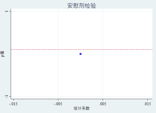 twoway(scatter pvaluecoef1,xlabel(-0.015(0.01)0.0155,grid) yline(0.1,lp(shortdash)) xline(1.5,lp(shortdash))xtitle(估计系数) ytitle(p值) msymbol(smcircle_hollow)mcolor(blue) legend(off))(kdensity coef1,title(安慰剂检验))