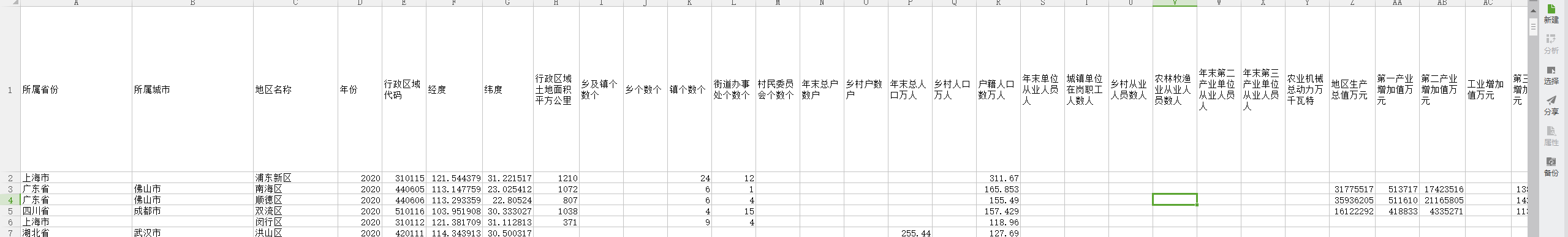 指标包含:所属省份 所属城市 地区名称 年份 行政区域代码 经度 纬度 行政区域土地面积平方公里 乡及镇个数个 乡个数个 镇个数个 街道办事处个数个 村民委员会个数个 年末总户数户 乡村户数户 年末总人口万人 乡村人口万人 户籍人口数万人 年末单位从业人员人 城镇单位在岗职工人数人 乡村从业人员数人 农林牧渔业从业人员数人 年末第二产业单位从业人员人 年末第三产业单位从业人员人 农业机械总动力万千瓦特 地区生产总值万元 第一产业增加值万元 第二产业增加值万元 工业增加值万元 第三产业增加值万元 农业增加值万元 牧业增加值万元 人均地区生产总值元人 城镇单位在岗职工平均工资元 城镇居民人均可支配收入元 农村居民人均可支配收入元 地方财政一般预算收入万元 各项税收万元 地方财政一般预算支出万元 城乡居民储蓄存款余额万元 年末金融机构各项贷款余额万元 出口额美元 实际利用外资金额美元 农作物总播种面积千公顷 常用耕地面积公顷 机收面积公顷 设施农业占地面积公顷 农用机械总动力千万瓦 粮食总产量吨 棉花产量吨 油料产量吨 肉类总产量吨 农林牧渔业总产值万元 规模以上工业企业数个 规模以上工业总产值万元 城镇固定资产投资完成额万元 全社会固定资产投资万元 社会消费品零售总额万元 房地产开发投资亿元 普通小学学校数个 普通中学学校数个 普通小学专任教师数人 普通中学专任教师数人 普通小学在校生数人 普通中学在校学生数人 中等职业教育学校在校学生数人 医院卫生院床位数床 医院和卫生院卫生人员数_卫生技术人员人 医院和卫生院卫生人员数_执业医师人 各种社会福利收养性单位数个 各种社会福利收养性单位床位数床 全社会用电量万千瓦时 城乡居民生活用电量万千瓦时 废气中氮氧化物排放量吨 废气中烟尘排放量吨 工业废气中二氧化硫排放量吨 艺术表演场馆数_剧场影剧院个 公共图书馆总藏量千册 体育场馆机构数个 固定电话用户户 移动电话用户数户 宽带接入用户数户 人口基本状况(全部数据)--人口数(人) 人口基本状况(全部数据)--人口数(人)--男性人口(人) 人口基本状况(全部数据)--人口数(人)--女性人口(人) 人口基本状况(全部数据)--人口数(人)--性别比(女=100) 人口基本状况(全部数据)--少数民族人口比重(%) 人口基本状况(全部数据)--城乡人口--城镇人口(人) 人口基本状况(全部数据)--城乡人口--乡村人口(人) 人口基本状况(全部数据)--城市城区人口(人) 人口基本状况(全部数据)--家庭户数(户) 人口基本状况(全部数据)--家庭户数(户)--人口数(人) 人口基本状况(全部数据)--家庭户数(户)--户规模(人/户) 人口基本状况(全部数据)--家庭户数(户)--其中:一人户(户) 人口基本状况(全部数据)--家庭户类别--一代户(户) 人口基本状况(全部数据)--家庭户类别--二代户(户) 人口基本状况(全部数据)--家庭户类别--三代户(户) 人口基本状况(全部数据)--家庭户类别--四代以上户(户) 分年龄、性别的人口(全部数据)--0岁--0岁男性人口(人) 分年龄、性别的人口(全部数据)--0岁--0岁女性人口(人) 分年龄、性别的人口(全部数据)--1-4岁--1-4岁男性人口(人) 分年龄、性别的人口(全部数据)--1-4岁--1-4岁女性人口(人) 分年龄、性别的人口(全部数据)--5-9岁--5-9岁男性人口(人) 分年龄、性别的人口(全部数据)--5-9岁--5-9岁女性人口(人) 分年龄、性别的人口(全部数据)--10-14岁--10-14岁男性人口(人) 分年龄、性别的人口(全部数据)--10-14岁--10-14岁女性人口(人) 分年龄、性别的人口(全部数据)--15-19岁--15-19岁男性人口(人) 分年龄、性别的人口(全部数据)--15-19岁--15-19岁女性人口(人) 分年龄、性别的人口(全部数据)--20-24岁--20-24岁男性人口(人) 分年龄、性别的人口(全部数据)--20-24岁--20-24岁女性人口(人) 分年龄、性别的人口(全部数据)--25-29岁--25-29岁男性人口(人) 分年龄、性别的人口(全部数据)--25-29岁--25-29岁女性人口(人) 分年龄、性别的人口(全部数据)--30-34岁--30-34岁男性人口(人) 分年龄、性别的人口(全部数据)--30-34岁--30-34岁女性人口(人) 分年龄、性别的人口(全部数据)--35-39岁--35-39岁男性人口(人) 分年龄、性别的人口(全部数据)--35-39岁--35-39岁女性人口(人) 分年龄、性别的人口(全部数据)--40-44岁--40-44岁男性人口(人) 分年龄、性别的人口(全部数据)--40-44岁--40-44岁女性人口(人) 分年龄、性别的人口(全部数据)--45-49岁--45-49岁男性人口(人) 分年龄、性别的人口(全部数据)--45-49岁--45-49岁女性人口(人) 分年龄、性别的人口(全部数据)--50-54岁--50-54岁男性人口(人) 分年龄、性别的人口(全部数据)--50-54岁--50-54岁女性人口(人) 分年龄、性别的人口(全部数据)--55-59岁--55-59岁男性人口(人) 分年龄、性别的人口(全部数据)--55-59岁--55-59岁女性人口(人) 分年龄、性别的人口(全部数据)--60-64岁--60-64岁男性人口(人) 分年龄、性别的人口(全部数据)--60-64岁--60-64岁女性人口(人) 分年龄、性别的人口(全部数据)--65-69岁--65-69岁男性人口(人) 分年龄、性别的人口(全部数据)--65-69岁--65-69岁女性人口(人) 分年龄、性别的人口(全部数据)--70-74岁--70-74岁男性人口(人) 分年龄、性别的人口(全部数据)--70-74岁--70-74岁女性人口(人) 分年龄、性别的人口(全部数据)--75-79岁--75-79岁男性人口(人) 分年龄、性别的人口(全部数据)--75-79岁--75-79岁女性