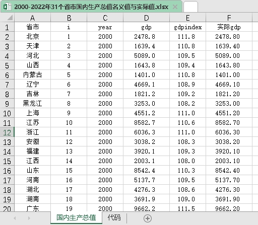 2000-2022年31个省市国内生产总值名义值与实际值.xlsx