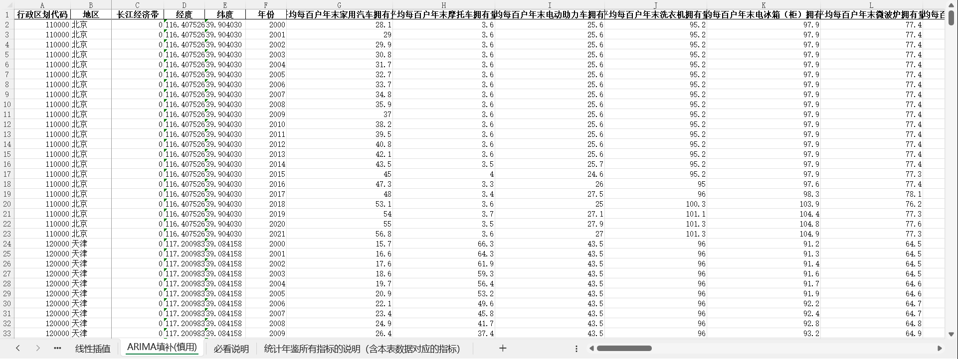 excel数据文件包原始数据-宽面板(由于多年度指标不同存在缺失值)、线性插值、ARIMA填补三个版本,提供您参考使用。