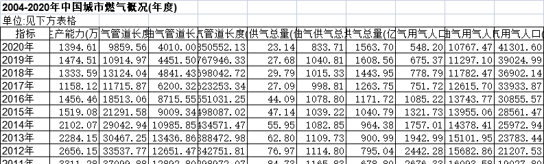 该数据包含了2004-2020年中国城市燃气概况(年度)。2009年人工煤气生产能力为11099.45万立方米/日,人工煤气管道长度为40446.98公里,液化石油气管道长度为14235.61公里,天然气管道长度为218778.15公里,人工煤气供气总量为361.55亿立方米。