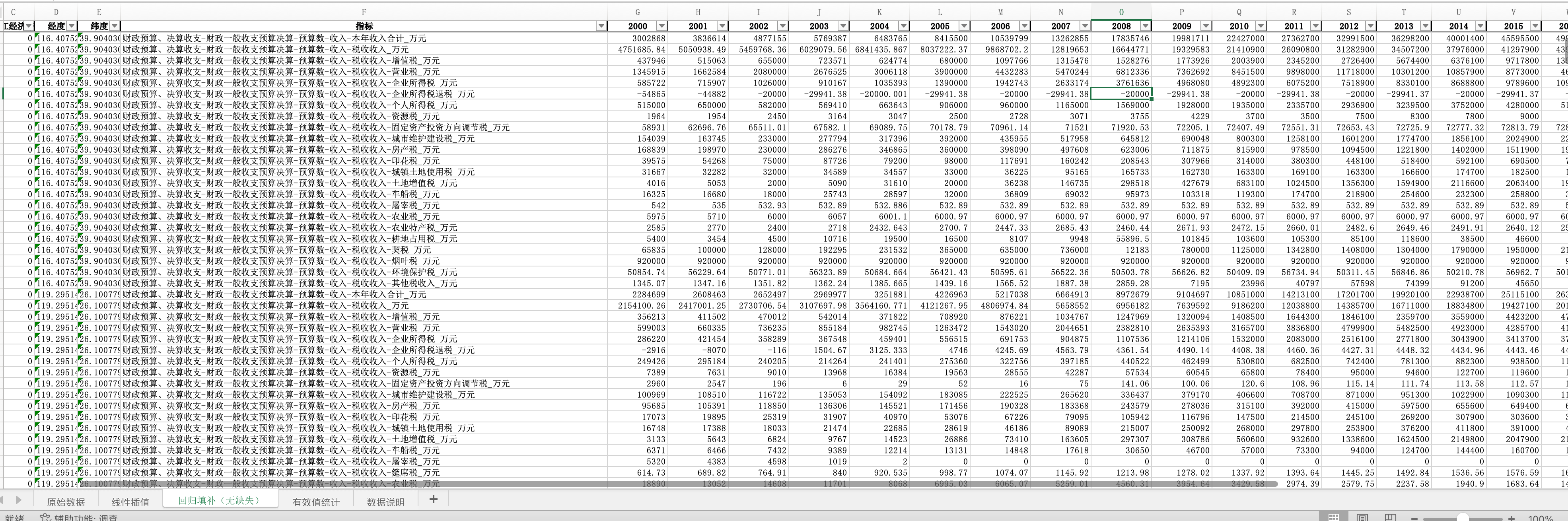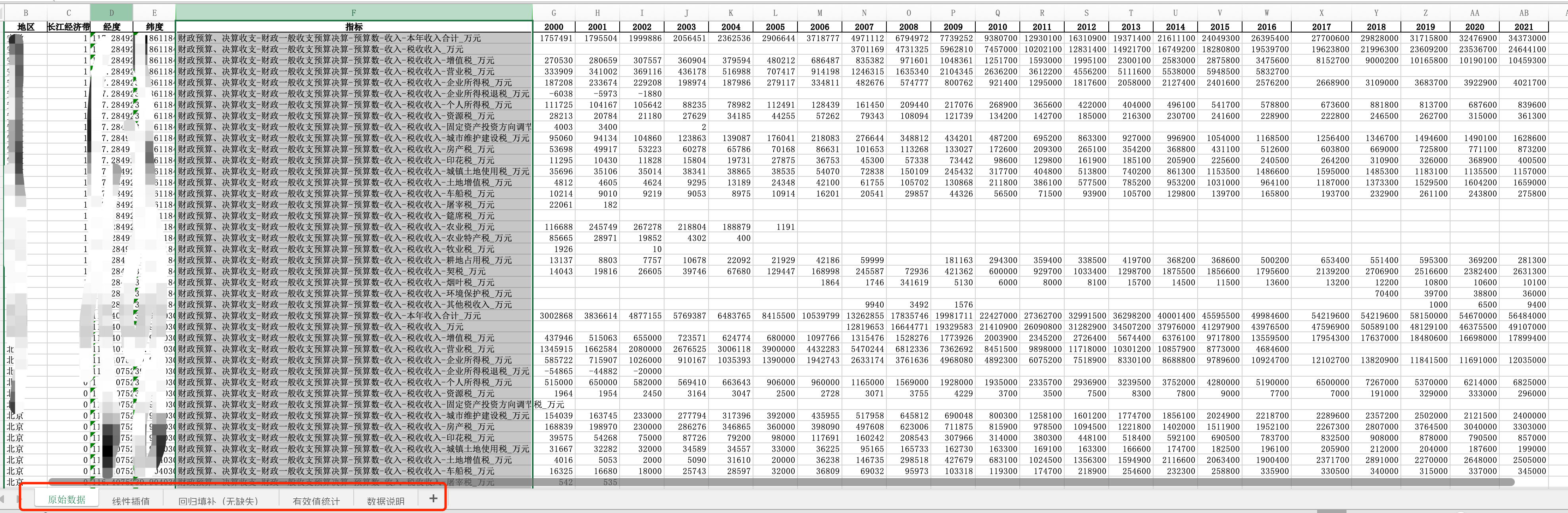 数据格式:Excel面板数据含原始数据(由于多年度指标不同存在缺失值)、线性插值、回归填补(无缺失)三个版本,提供您参考使用。其中,回归填补无缺失值。