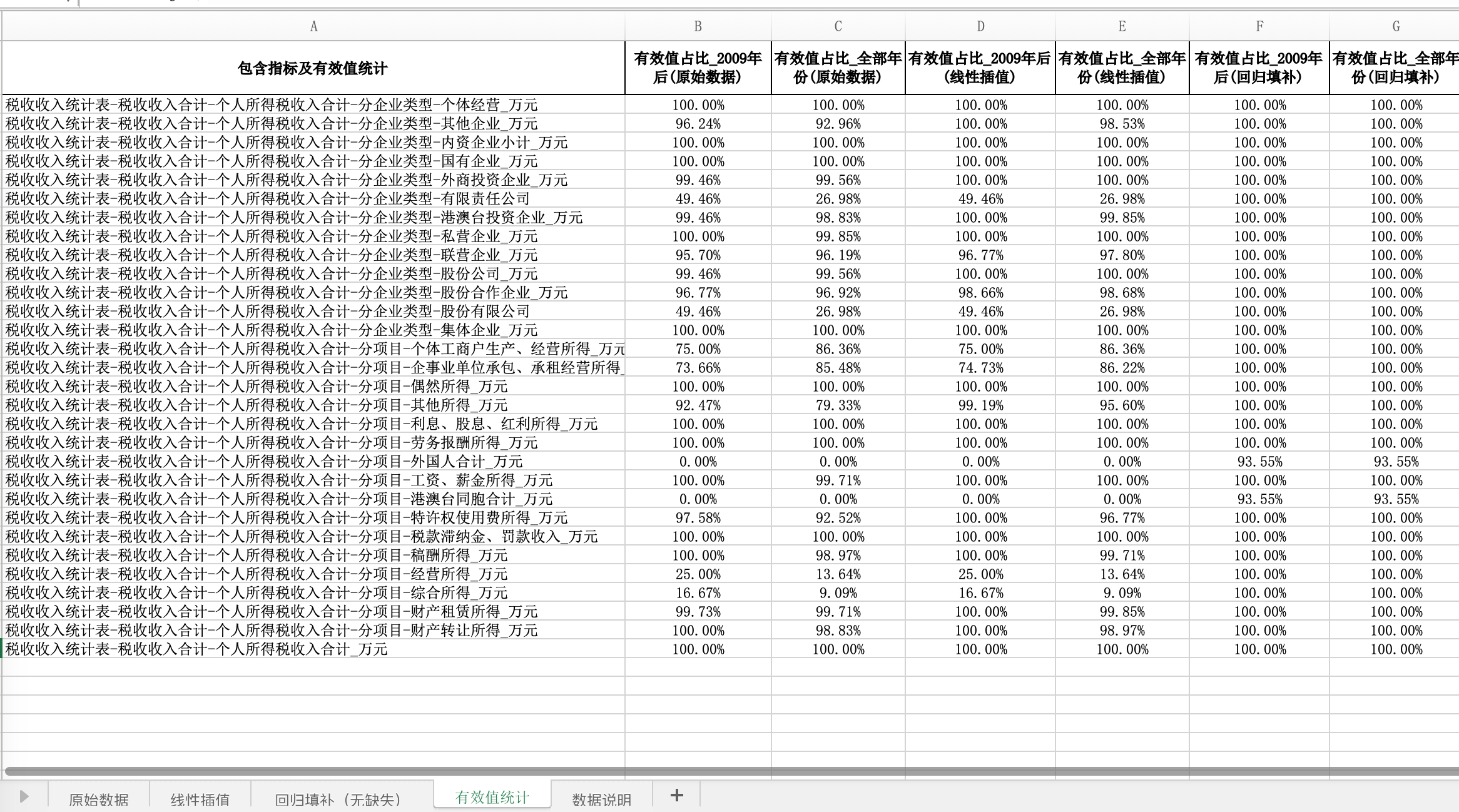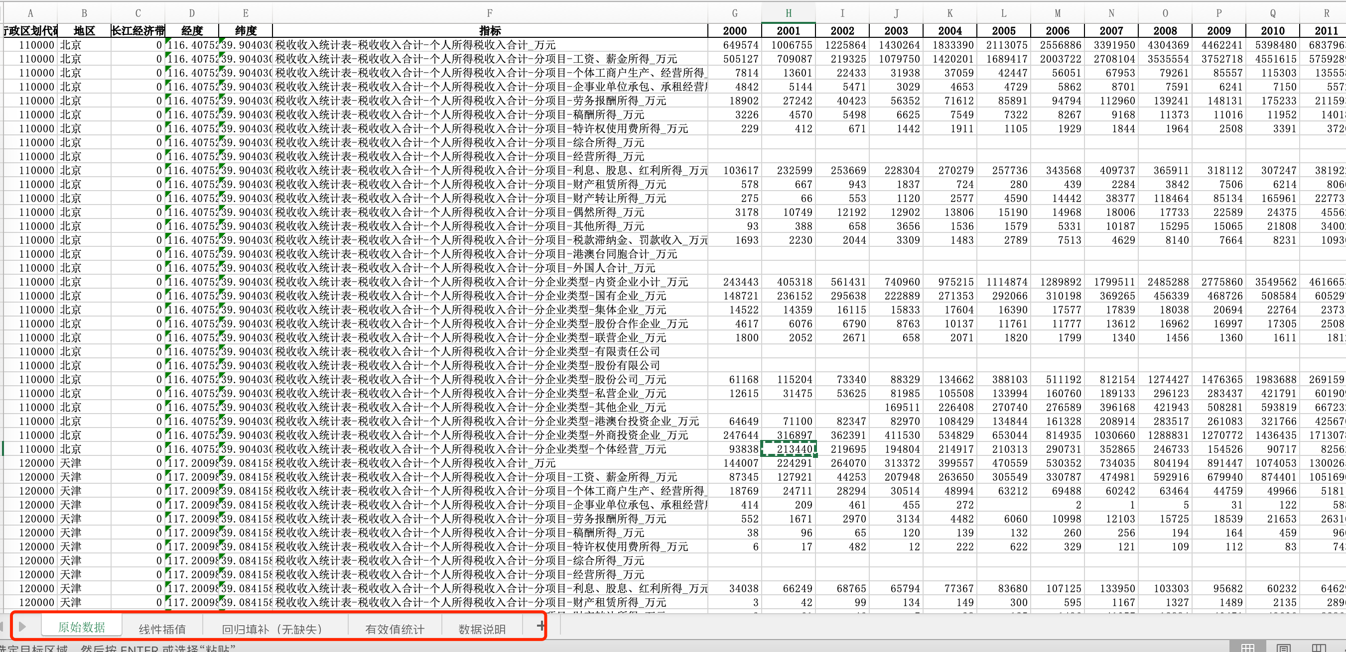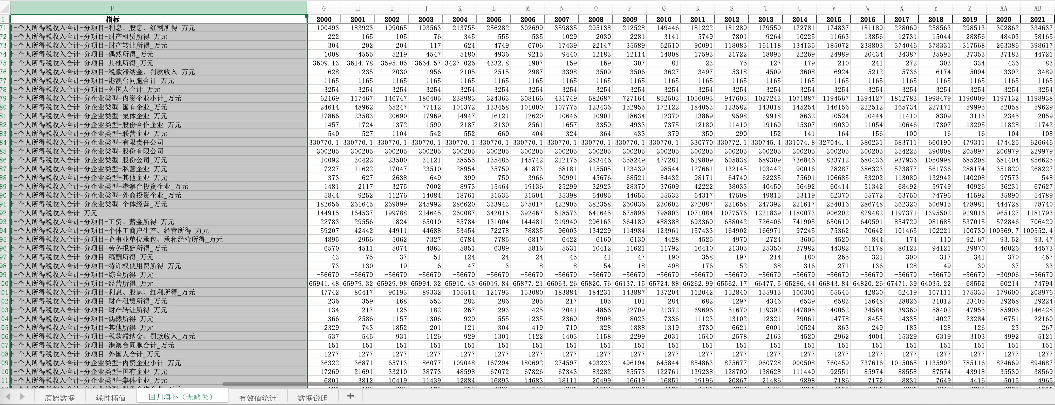 数据名称:2021-2000全国31省份各省个人所得税收入明细个体经营企业外商投资劳务报酬薪酬经营所得税收(插值填补无缺版)