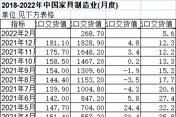 该数据包含了2018-2022年中国家具制造业(月度)。2021年12月家具制造业出口交货值_当期值为181.10亿元,家具制造业出口交货值_累计值为1828.90亿元,家具制造业出口交货值_同比增长为4.8%,家具制造业出口交货值_累计增长为12.3%。