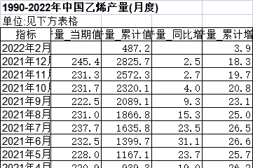 该数据包含了1990-2022年中国乙烯产量(月度)。2021年3月乙烯产量_当期值为248.9万吨,乙烯产量_累计值为718.4万吨,乙烯产量_同比增长为27.8%,乙烯产量_累计增长为28.6%。