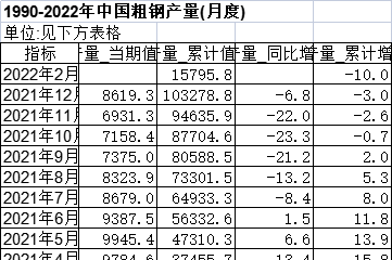 该数据包含了1990-2022年中国粗钢产量(月度)。2021年5月粗钢产量_当期值为9945.4万吨,粗钢产量_累计值为47310.3万吨,粗钢产量_同比增长为6.6%,粗钢产量_累计增长为13.9%。