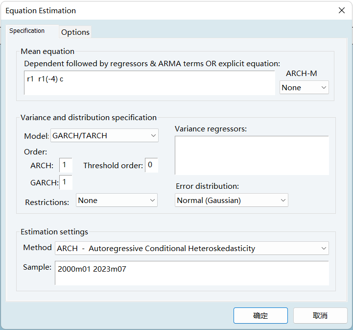 我想问一下,用EViews做Garch(1,1)检验,在通过ARCH检验的情况下,我首先用ARDL确认滞后阶数,确定为滞后4阶,然后用ARCH跑。跑的过程中,这样输入公式可以嘛,还是Garch(1,1)吗,如果后面带了滞后了4阶,其他的不变直接点确定: r1 r1(-4) c