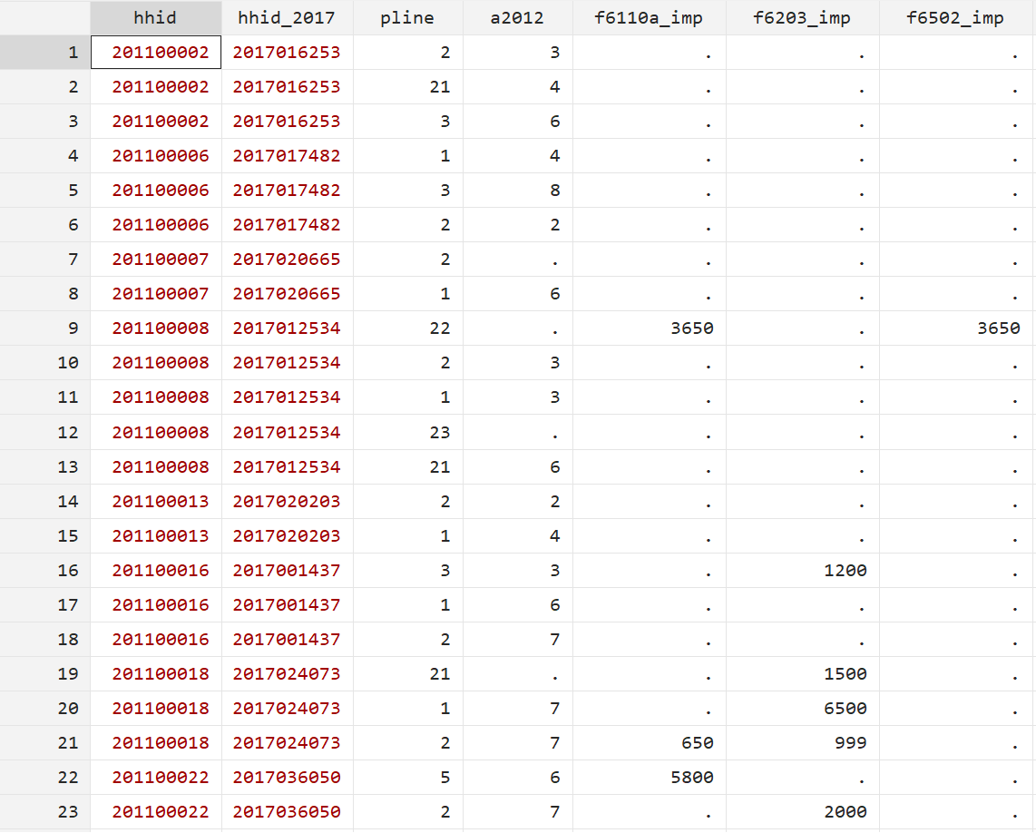 在上面的代码中,我们首先使用`egen`命令对每个变量进行求和,并按照`hhid`分类。然后,使用`replace`命令将空白值替换为零。