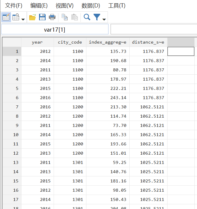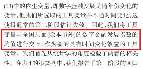 各位前辈,在做工具变量时遇到一个问题,因为各地级市到杭州的球面距离是截面数据。在跑回归时需要拿球面距离与全国层面(除本市外)的数字金融发展指数的均值进行交互,使其具备时变的特性。