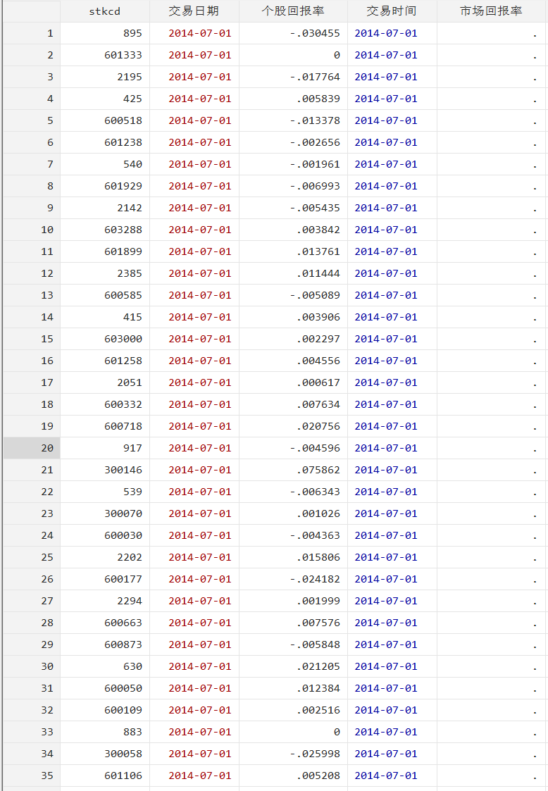 咋看看数据排序问题呢,个股回报率和指数收益率的数据是否按照日期进行了排序,merge命令需要确保两个数据 ...