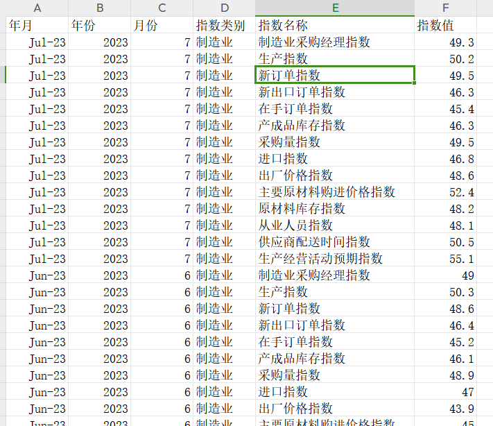 - 指数类别:指数大类,分为制造业、非制造业以及综合三个类别。综合类别下只有一个综合PMI产出指数。