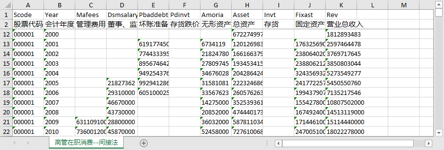上市公司高管在职消费间接法2001-2022管理费用董监高薪酬坏账存货跌价准备无形资产摊销营业总收入等