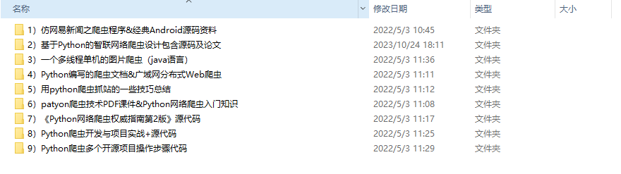 1)仿网易新闻之爬虫程序&经典Android源码资料2)基于Python的智联网络爬虫设计包含源码及论文3)一个多线程单机的图片爬虫(java语言)4)Python编写的爬虫文档&广域网分布式Web爬虫5)用python爬虫抓站的一些技巧总结6)patyon爬虫技术PDF课件&Python网络爬虫入门知识7)《Python网络爬虫权威指南第2版》源代码8)Python爬虫开发与项目实战+源代码9)Python爬虫多个开源项目操作步骤代码
