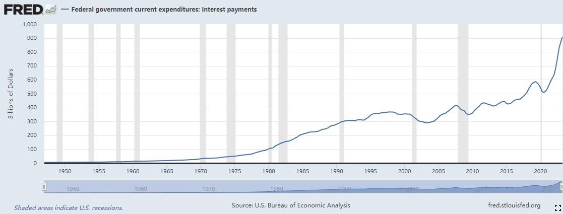导致美国联邦ZF付息规模快速上涨的原因有两点,一是ZF债务规模快速上涨,