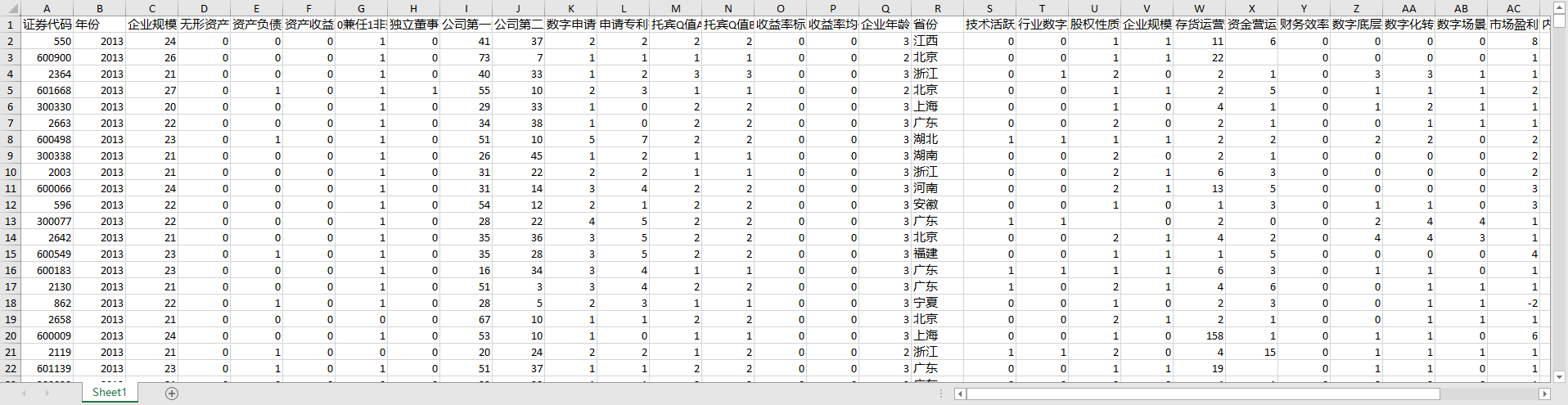 证券代码 年份 企业规模 无形资产占比 资产负债率 资产收益率 0兼任1非兼任 独立董事占比 公司第一大股东持股比例 公司第二大股东至第十大股东持股比例之和 数字申请专利数量 申请专利被引用 托宾Q值A 托宾Q值B 收益率标准差 收益率均值 企业年龄 省份 技术活跃度 行业数字属性 股权性质编码 企业规模 存货运营效率 资金营运效率 财务效率 数字底层技术转型 数字化转型总水平 数字场景应用转型 市场盈利能力 内部资本获利能力 持续获利能力 工具变量 行业代码 countsum 行业竞争