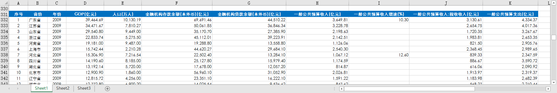 序号 省份 年份 GDP(亿元) 人口(万人) 金融机构存款余额(本外币)(亿元) 金融机构贷款余额(本外币)(亿元) 一般公共预算收入(亿元) 一般公共预算收入增速(%) 一般公共预算收入:税收收入(亿元) 一般公共预算支出(亿元)