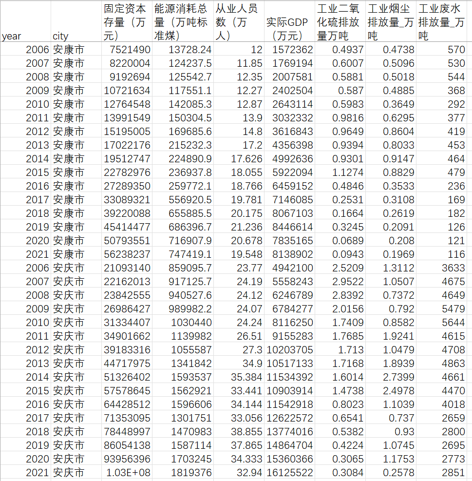 (1)原始数据:year city 固定资本存量(万元) 能源消耗总量(万吨标准煤) 从业人员数(万人) 实际GDP(万元) 工业二氧化硫排放量万吨 工业烟尘排放量_万吨 工业废水排放量_万吨 @' Y& S1 c4 {
