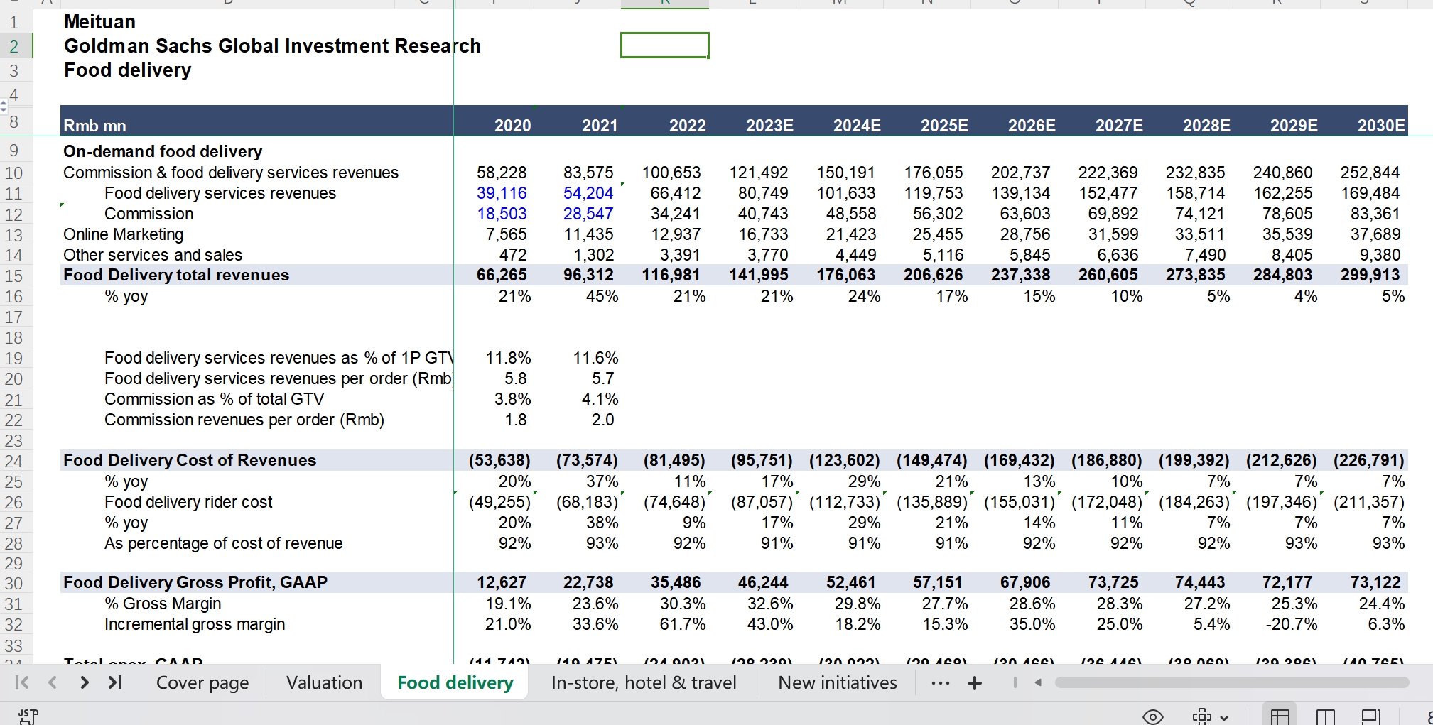 高盛2023年最新美团估值模型,有2023年第二季度以往历史所有季度的详细财务数据,并且预测到2030年的收入。估值模型里对美团的每个业务都创建了一张表,对每个业务进行了详细的预测和收入拆分,是极佳的估值学习模型,也是深入理解美团业务和估值逻辑的绝佳手册。