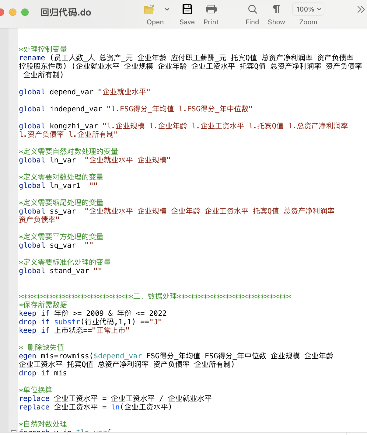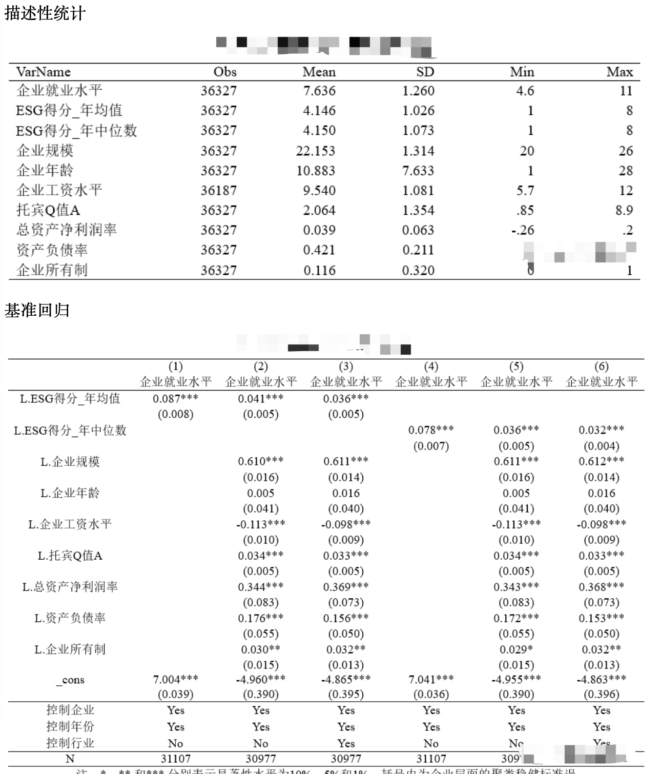 参照《经济研究》中毛其淋(2023)的做法,对《ESG的就业效应研究:来自中国上市公司的证据》一文中的基准回归部分进行复刻,文章从微观层面考察了ESG优势对就业的影响。ESG评级来自华证ESG数据,企业就业水平用上市公司i在t年的员工人数的对数表示。