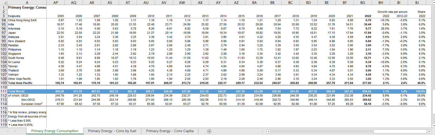全球世界各国1965-2022一次能源按燃料类型划分的消耗量人均消耗量石油天然气可再生能源.xlsx