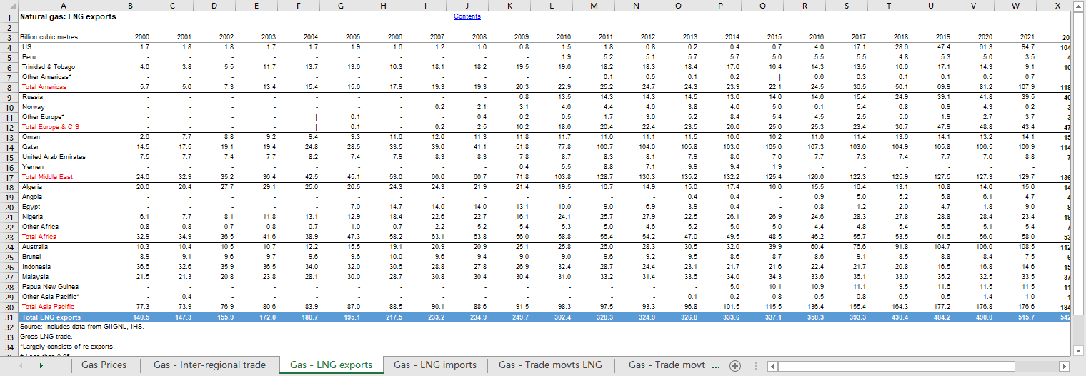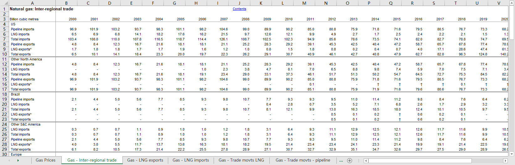 全球世界各国2000-2022天然气价格LNG液化天然气进口出口贸易动态流动管道.xlsx