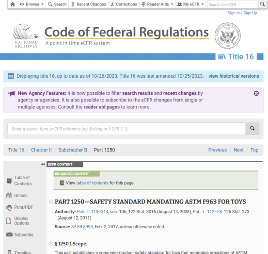 当前,联邦法规16 CFR 1250仍采用ASTM F963-17的标准。联邦法规16 CFR 1250政策链接:https://www.ecfr.gov/current/title-16/chapter-II/subchapter-B/part-1250